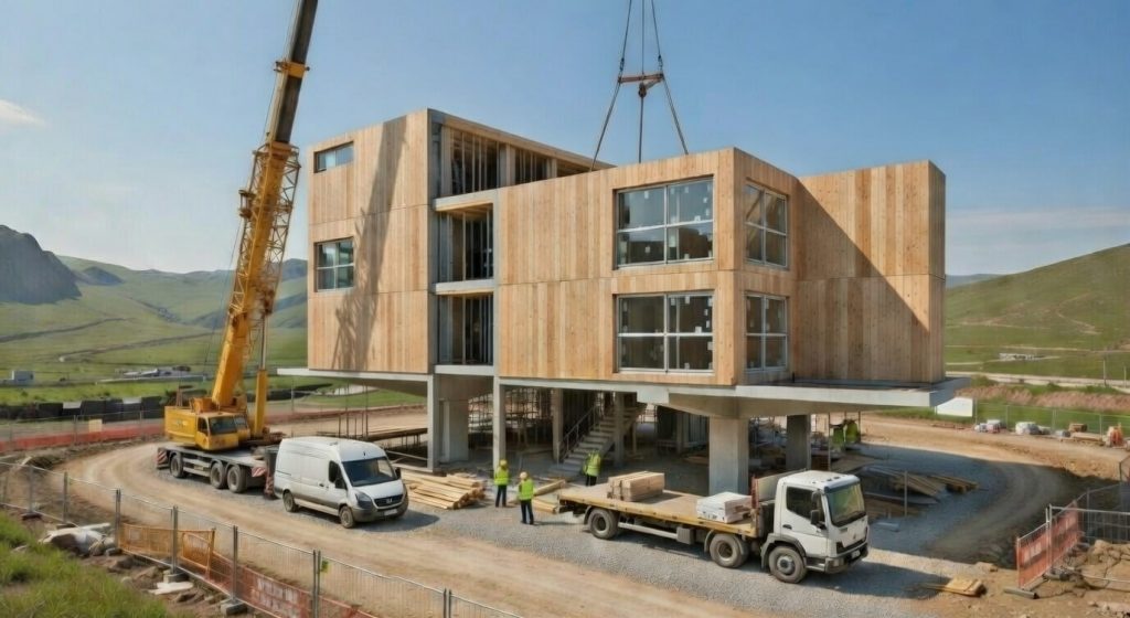 Seriell: Unsere Gebäude entstehen nicht auf der Baustelle, sondern im Werk. Mit Typengenehmigung und industrieller Präzision – Für höchste Qualität und kurze Bauzeiten.
