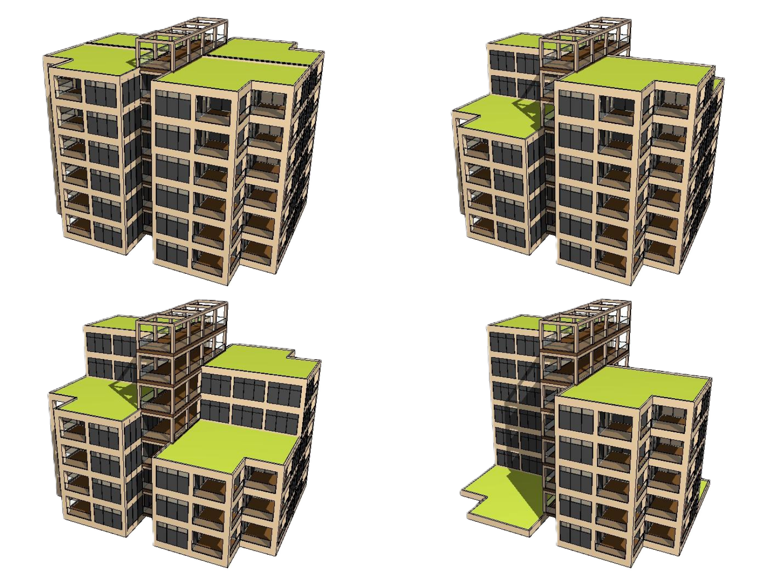 - Vier höhenvariable Teiltürme mit zentralem Erschließungsgerüst