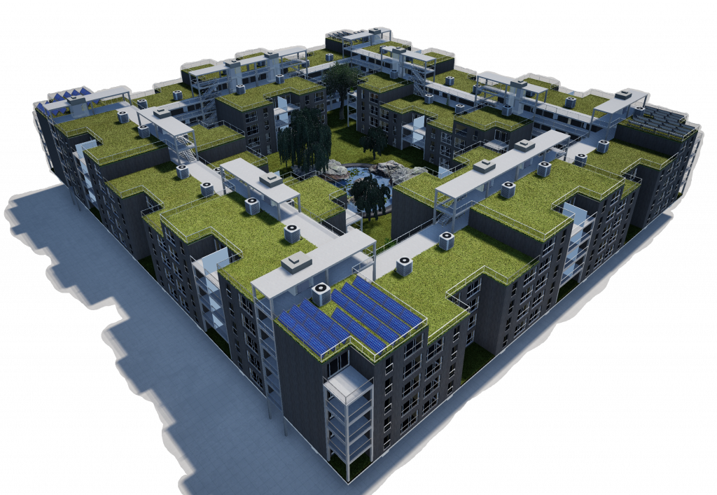 - Verbindung und Erschließung mehrerer Wohntürme über Dachwegesysteme möglich