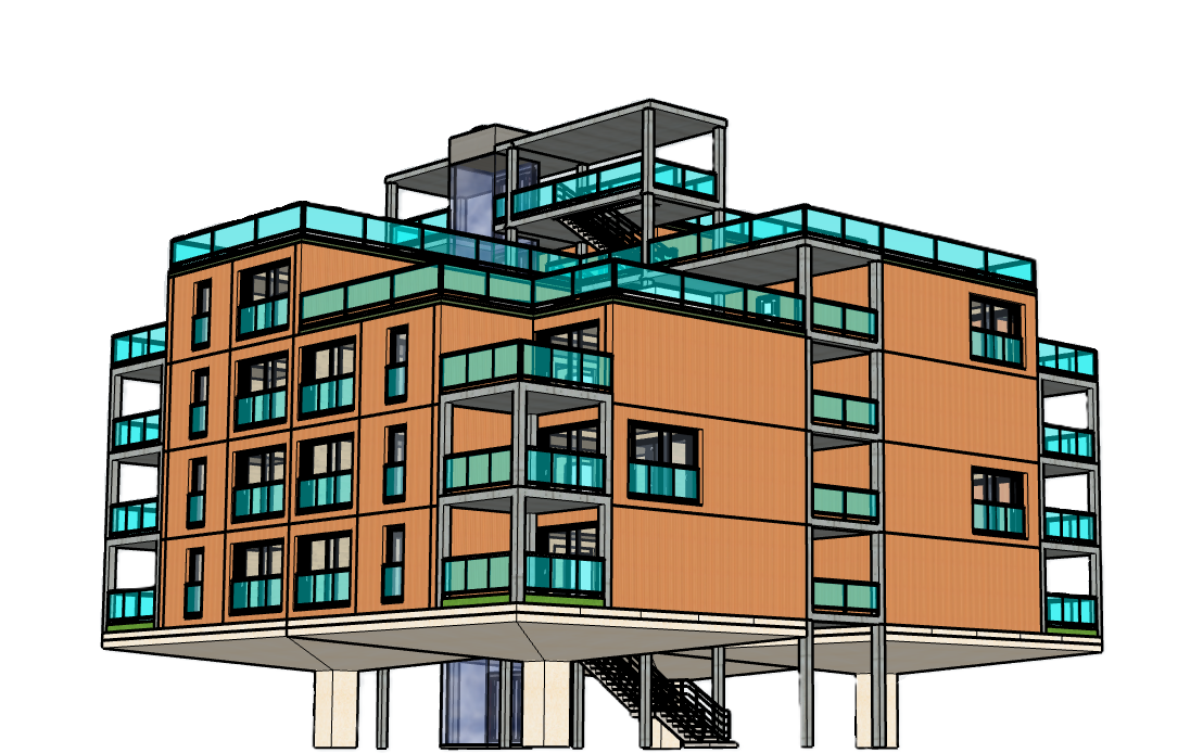 Ein serielles Montagesystem aus industriell vorgefertigten Holzwohnraummodulen, aufgeständert auf einer Betonplatte. Effiziente Erschließung durch separates Erschließungsgerüst mit maximal 6 Etagen.